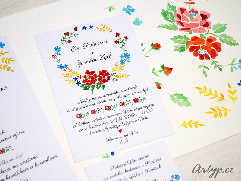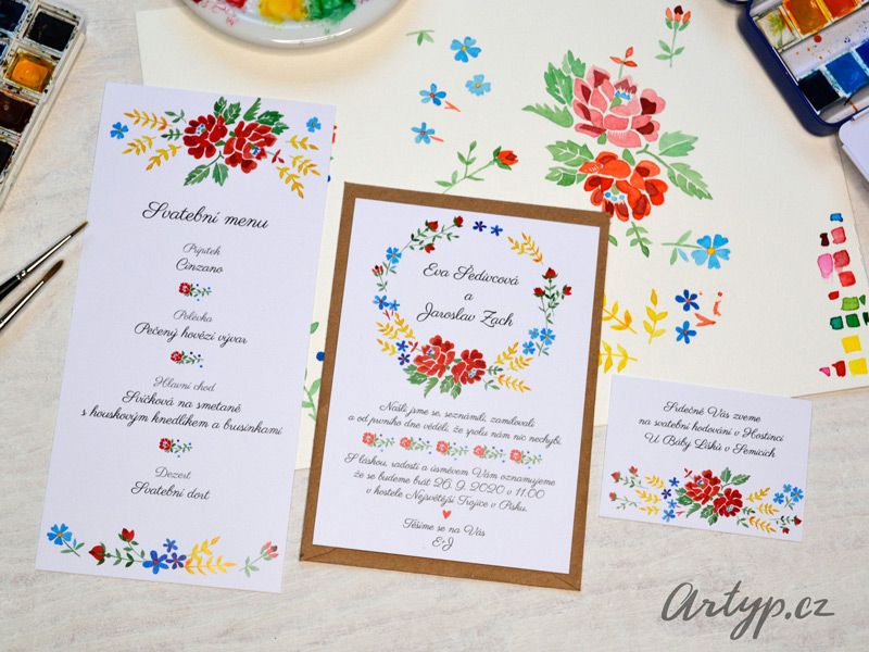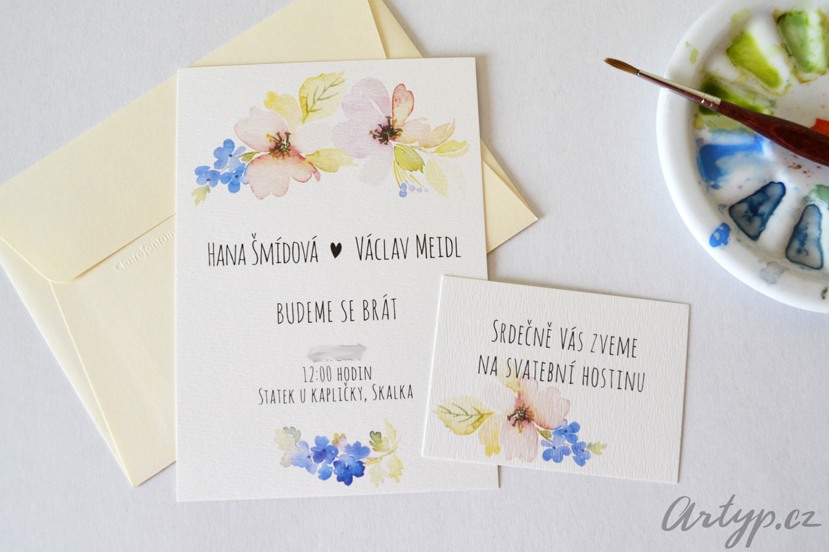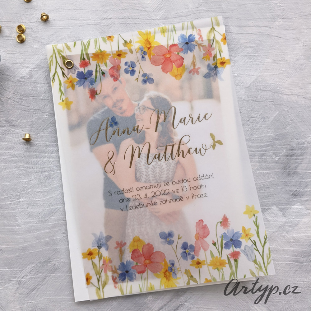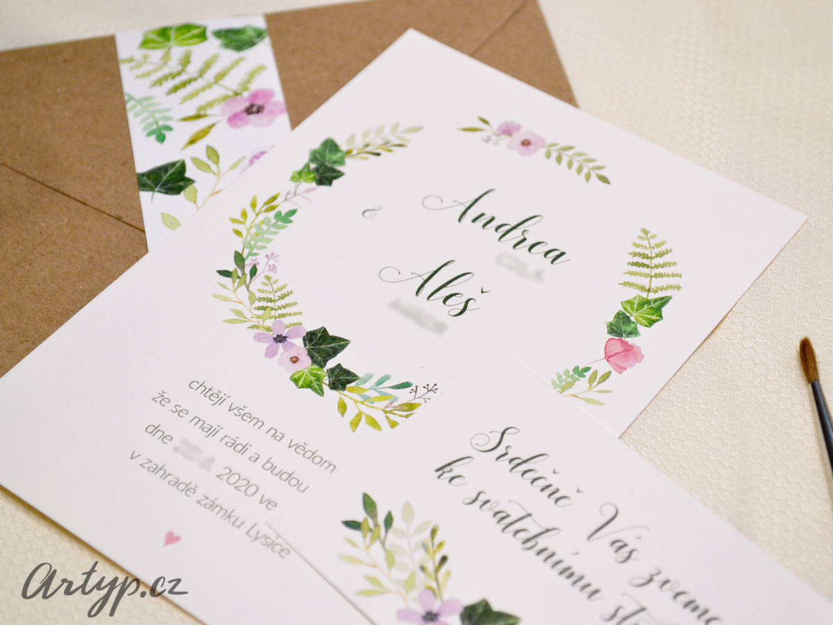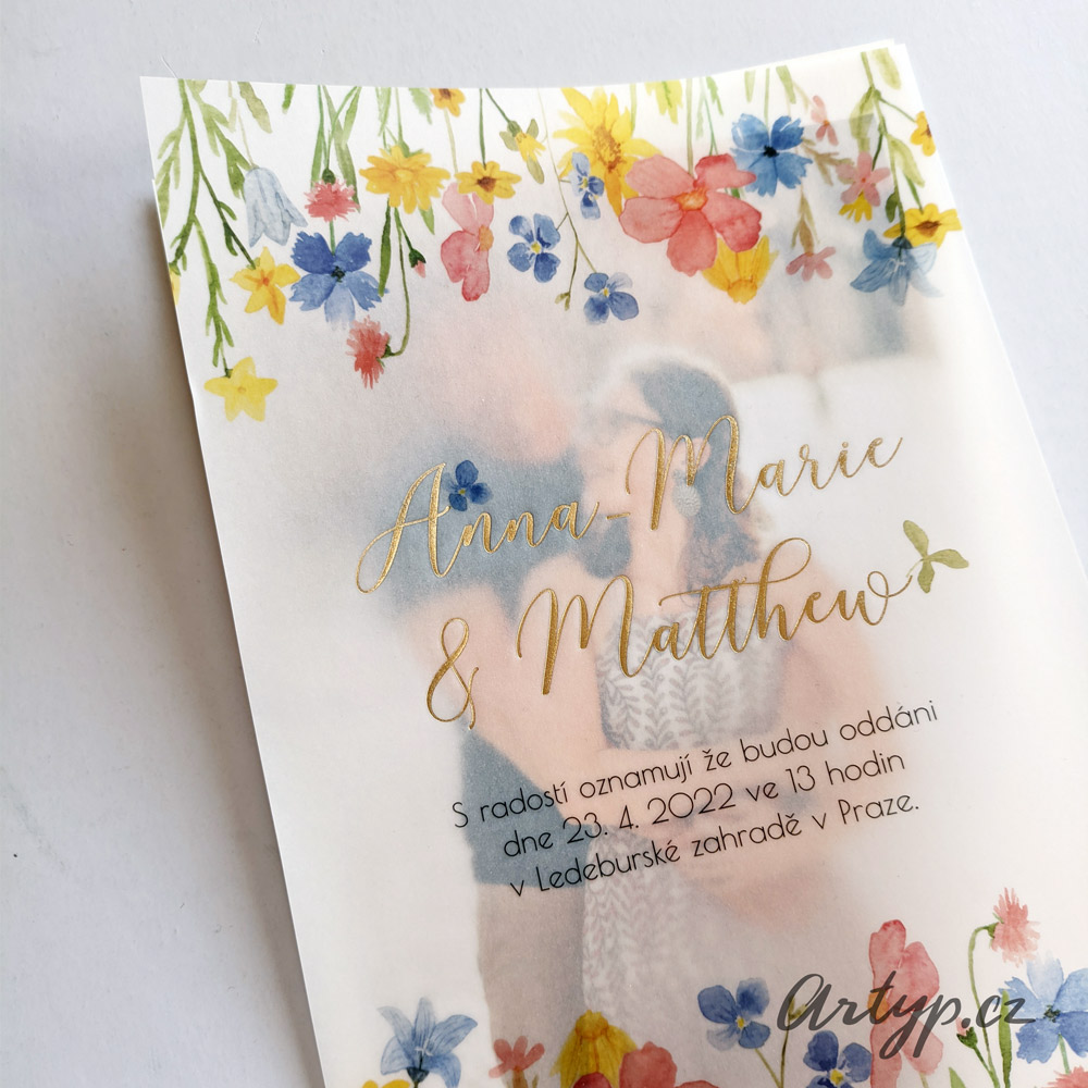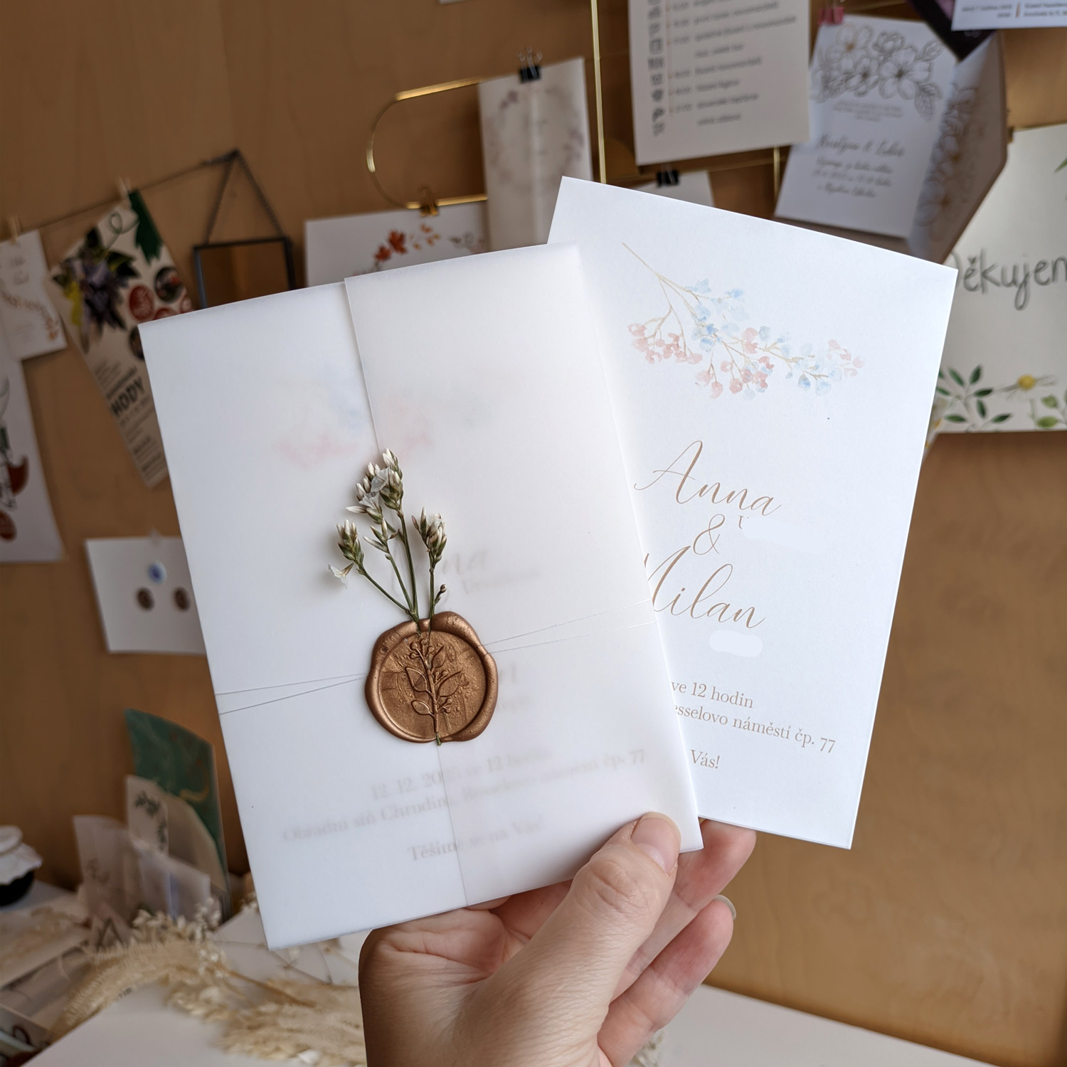 Kromě pozvánek ručně malovaných akvarelem, se rádi pustíme i do papírové skládačky, pozvánky s fotkou apod. Mimoto nabízíme tisk metalickými barvami (zlacení) a tisk na průhledný papír. Pozvánky na svatbu lze doplnit také o průhledné přebaly, pečetě či jiné dekorační prvky.