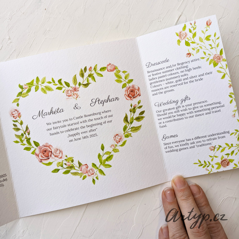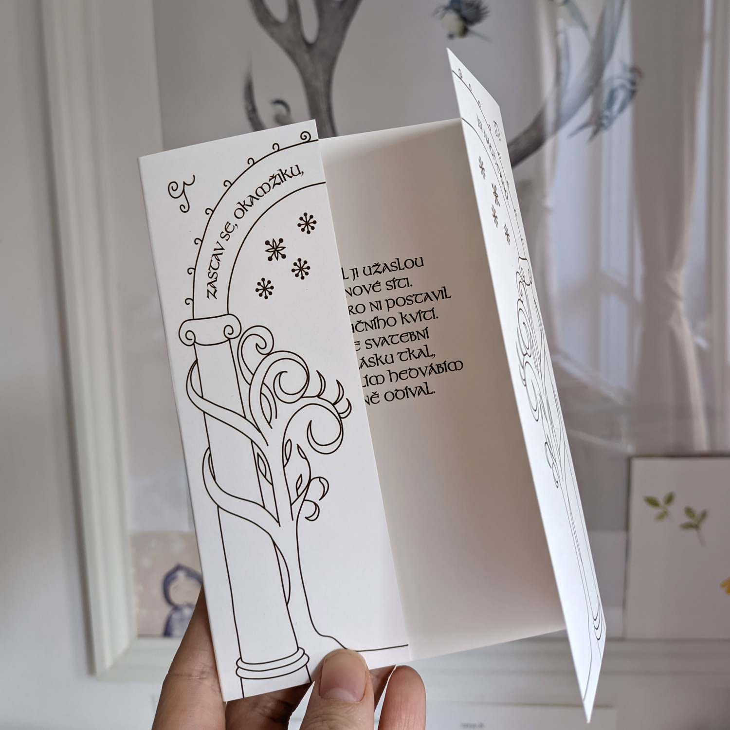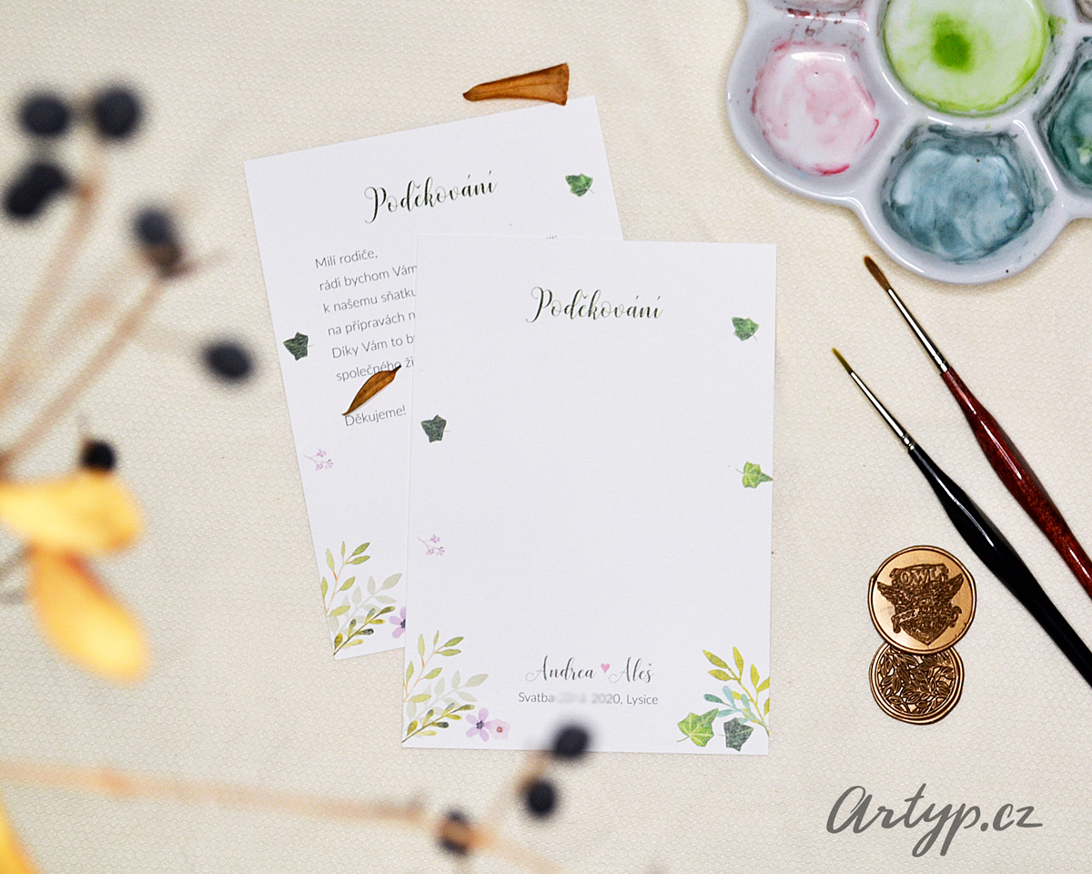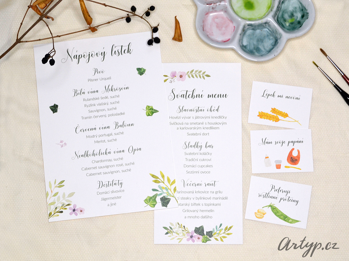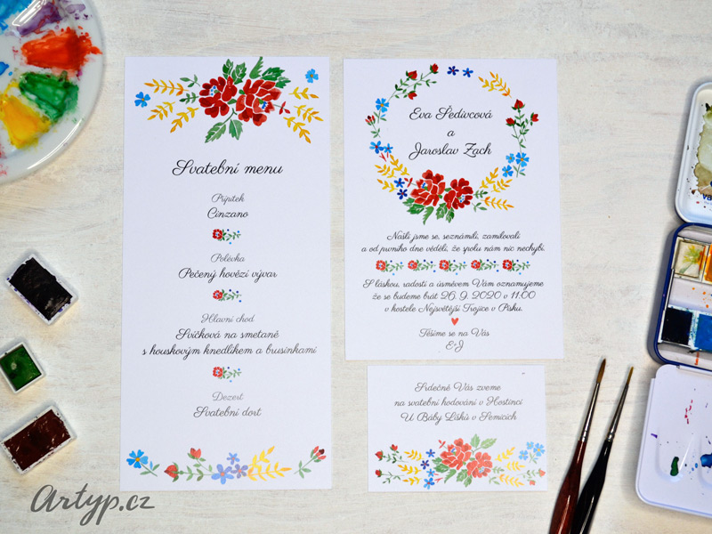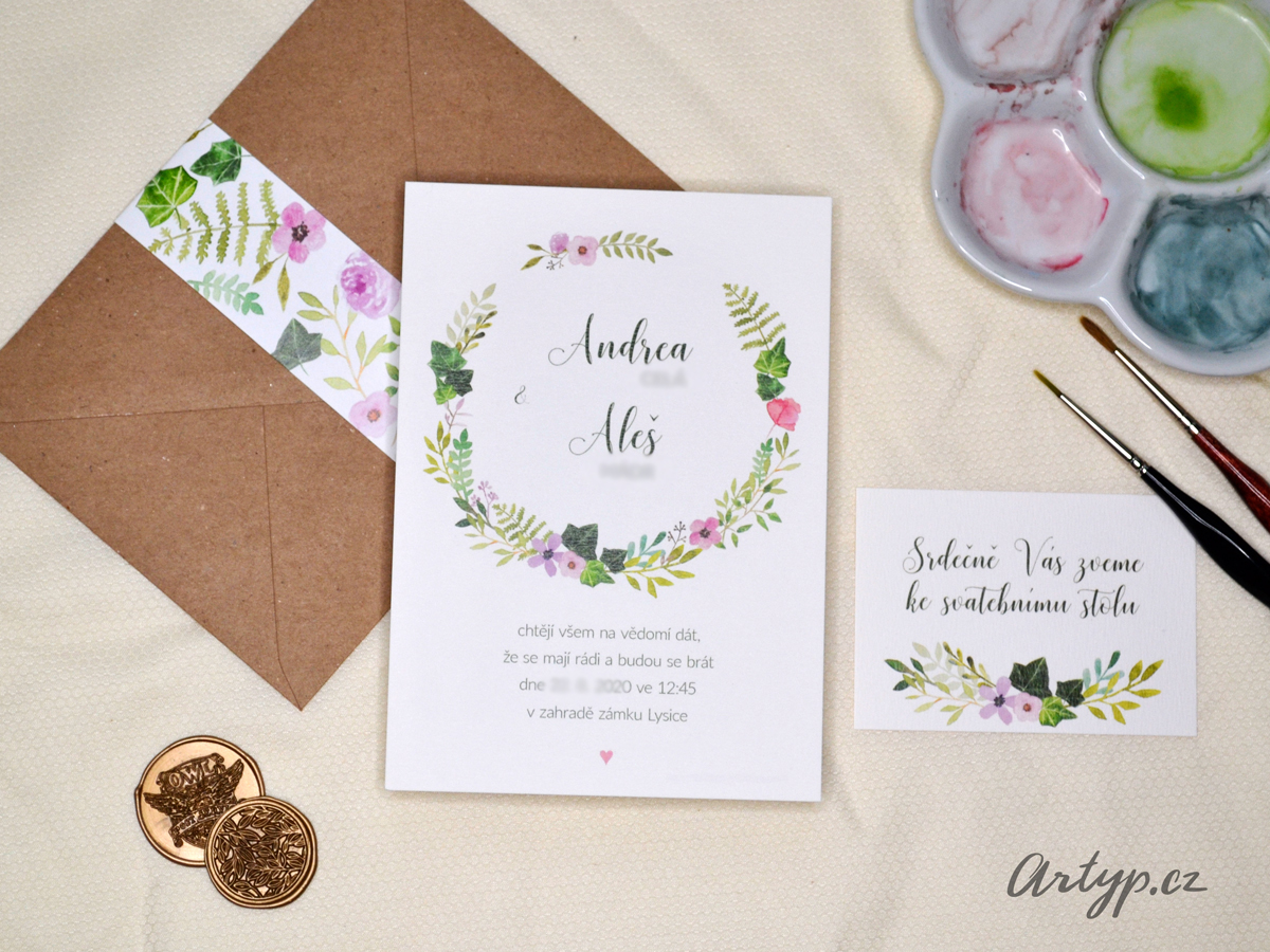 Kromě pozvánek ručně malovaných akvarelem, se rádi pustíme i do papírové skládačky, pozvánky s fotkou apod. Mimoto nabízíme tisk metalickými barvami (zlacení) a tisk na průhledný papír. Pozvánky na svatbu lze doplnit také o průhledné přebaly, pečetě či jiné dekorační prvky.