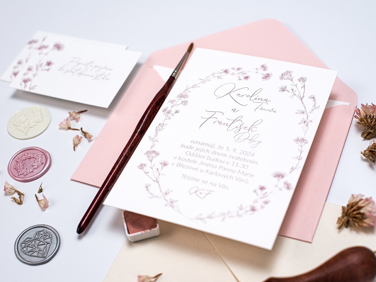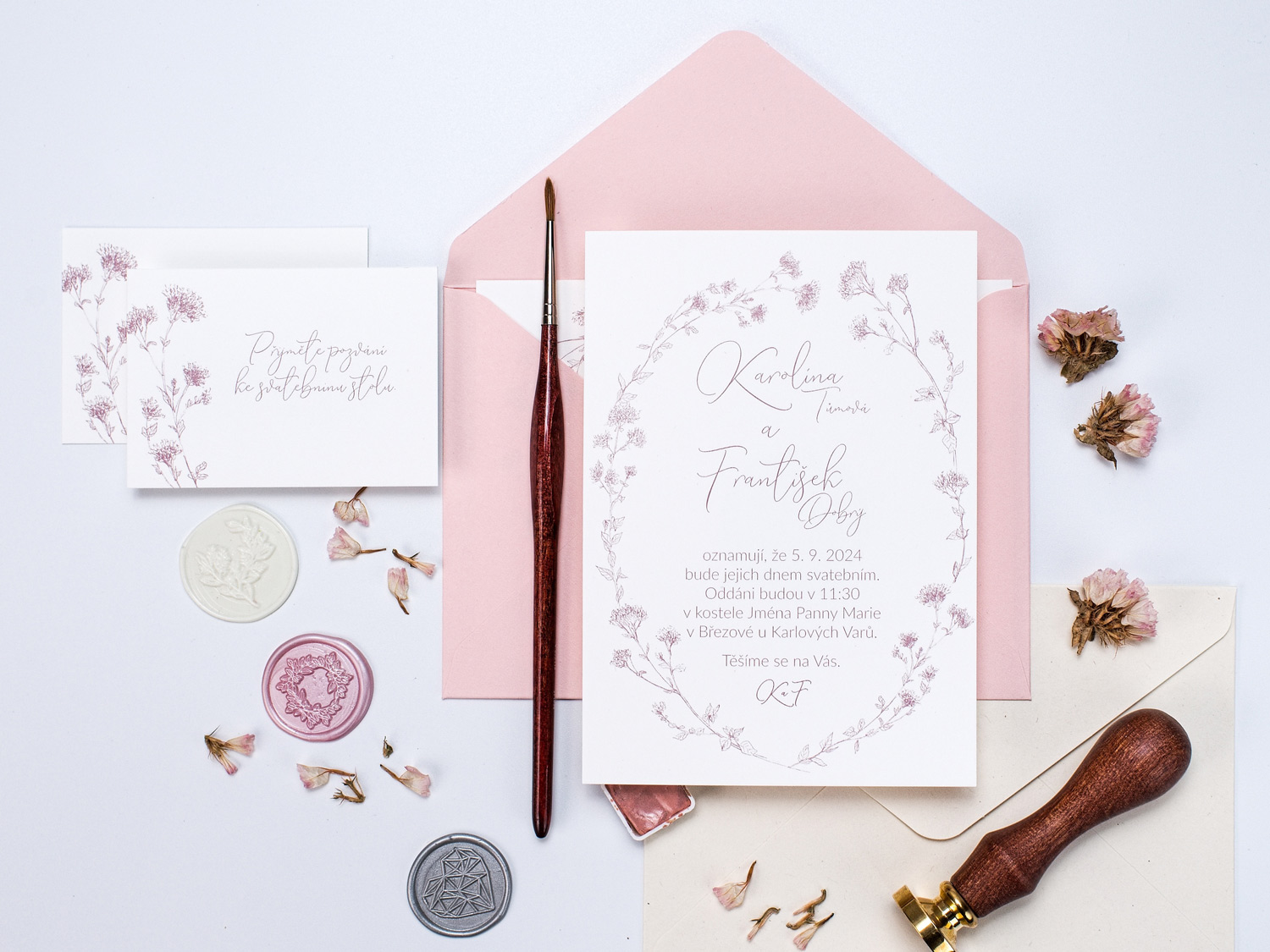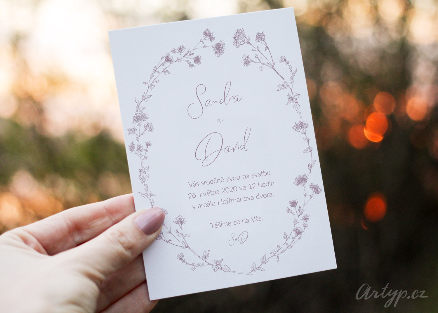 Něžné svatební oznámení s jemnou kresbou byliny Dobromysl.