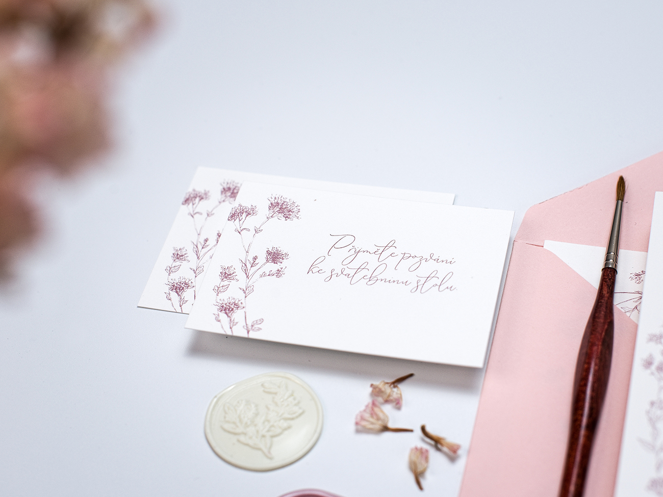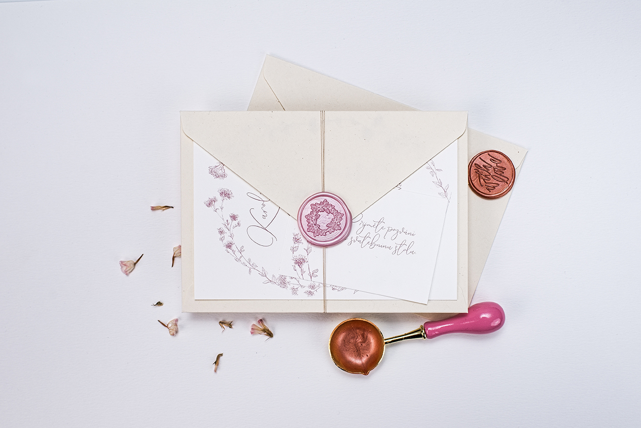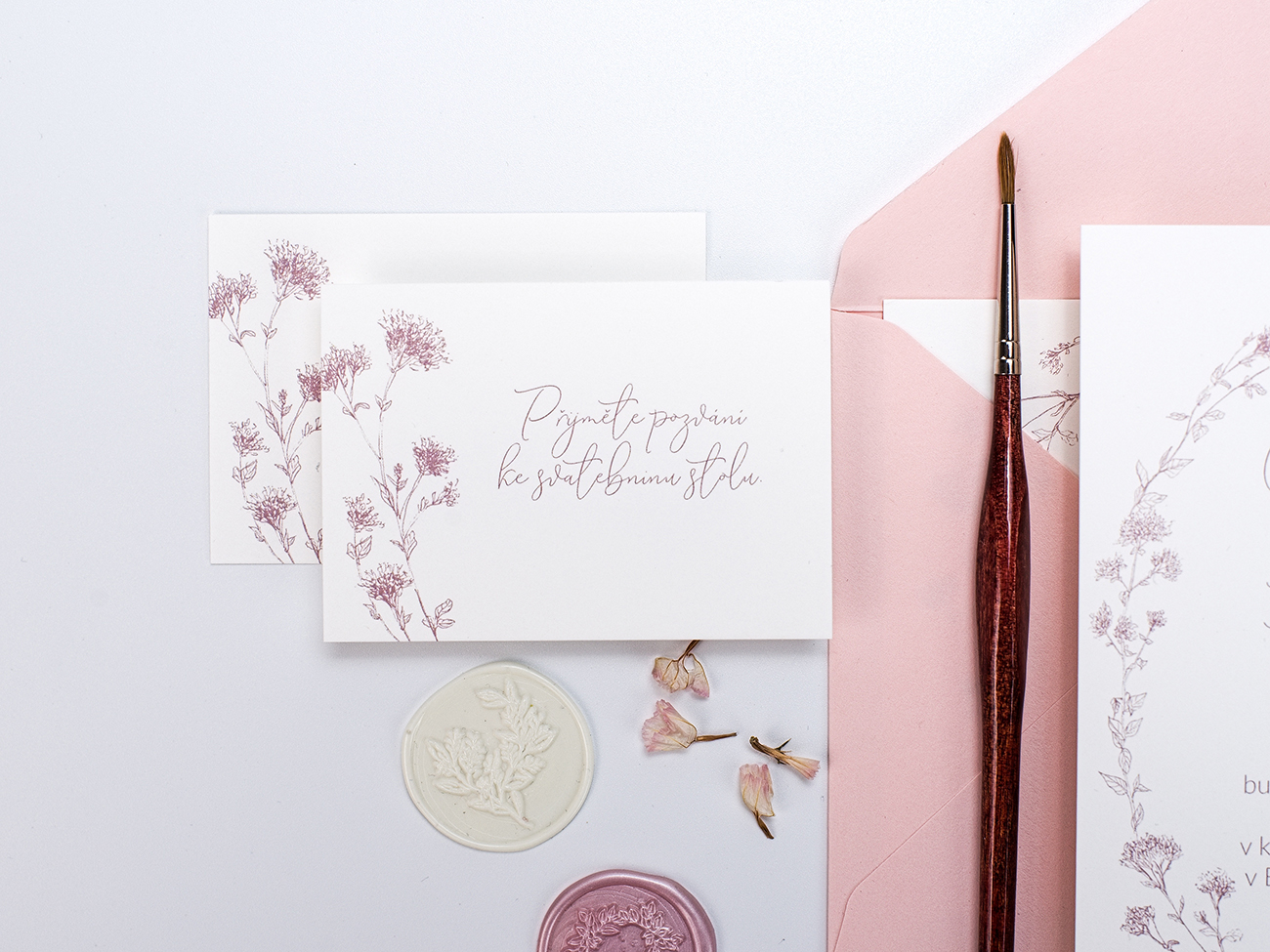 Něžné svatební oznámení s jemnou kresbou byliny Dobromysl.