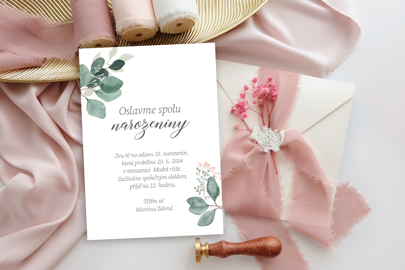 Pozvěte své přátele a rodinu naší narozeninovou pozvánkou. Elegantní motiv s eukalyptem je ručně malovaný v naší dílně.