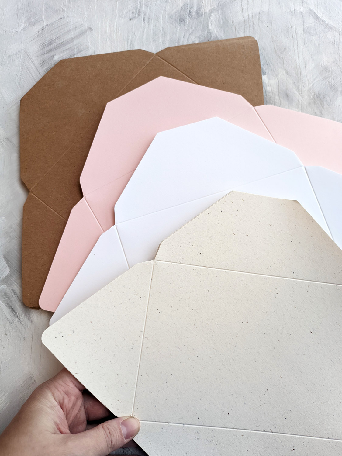 K dispozici je ze 3 papírů: jasně bílá, krémová s dřevitými kousky, craft (hnědá).