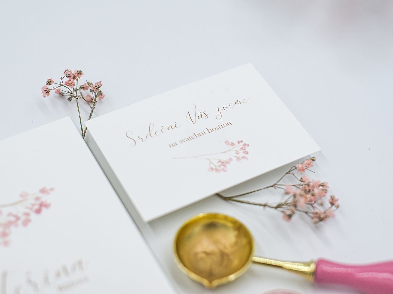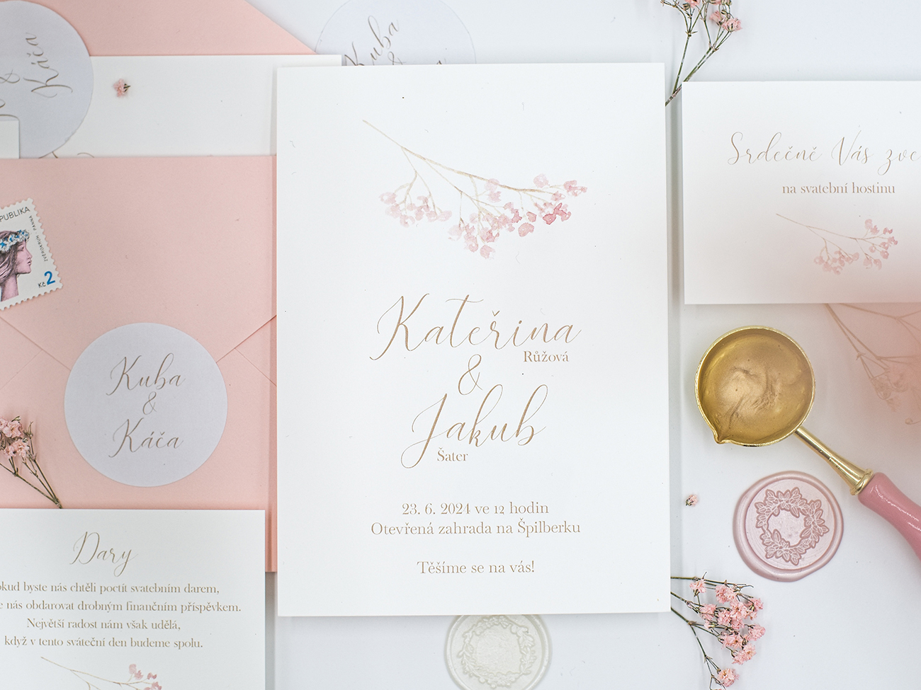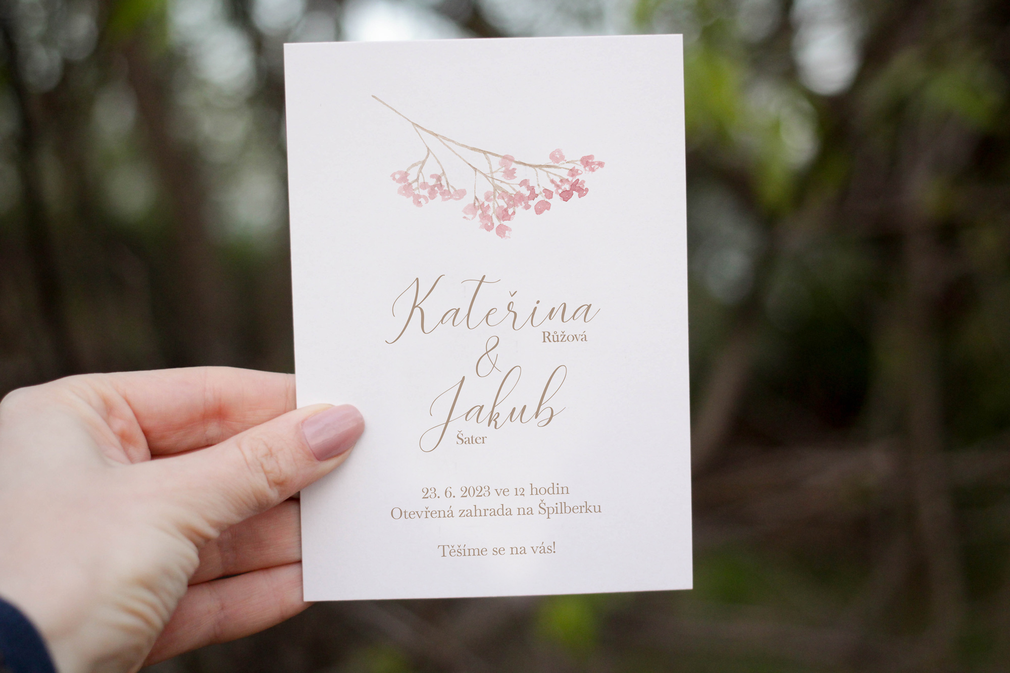 Něžné svatební oznámení s jemnou větvičkou růžového šateru, kterému se taky říká nevěstin závoj lat. Gypsophila. Ilustrace je malovaná akvarelem.