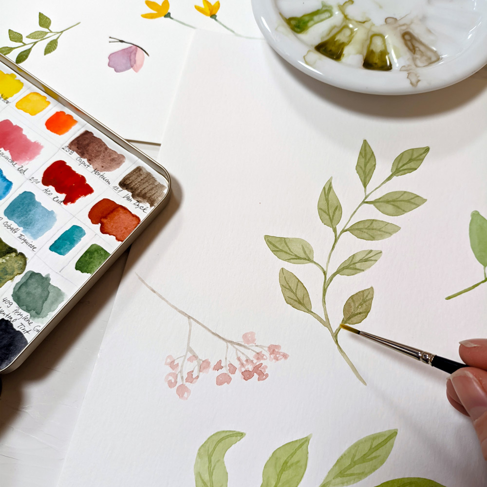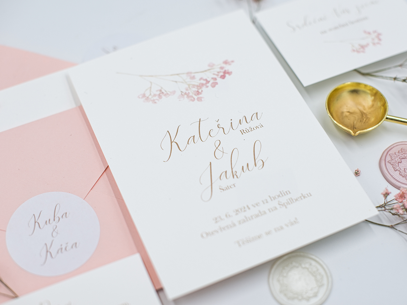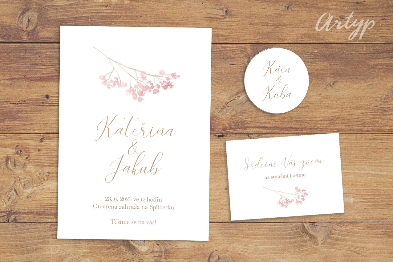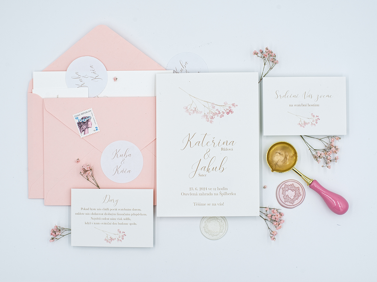 Něžné svatební oznámení s jemnou větvičkou růžového šateru, kterému se taky říká nevěstin závoj lat. Gypsophila. Ilustrace je malovaná akvarelem.