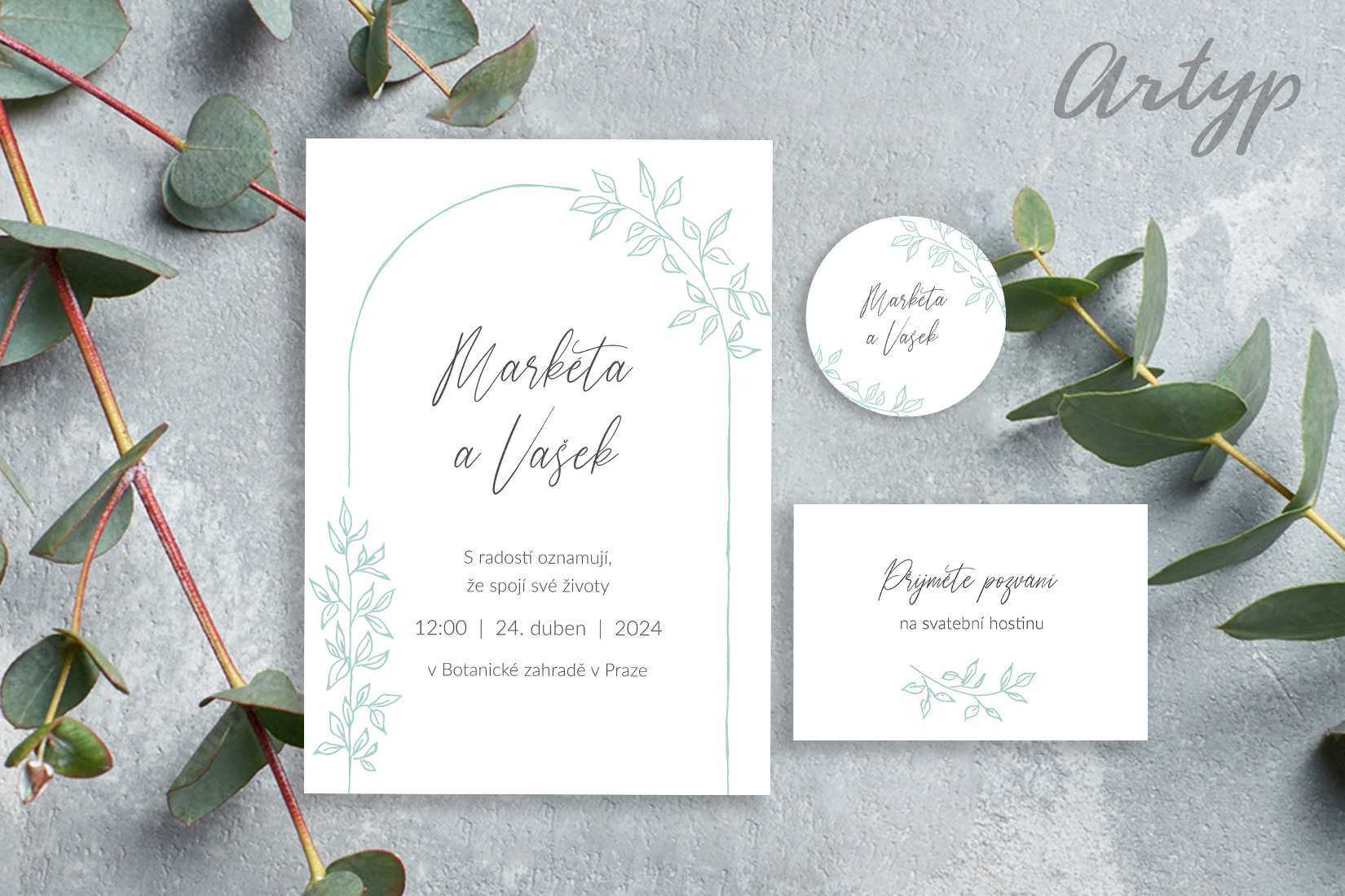 Svatební oznámení s jemnou kresbou slavobrány (oblouku). Slavobrána symbolizuje rozloučení se svobodou a vstup do nové etapy života. Ta na naší pozvánce je ručně kreslená v barvě sage green (mátová). Barvu můžeme přizpůsobit vašim přáním, aby každý detail tohoto oznámení byl jedinečným odrazem páru, který si ho vybere.
