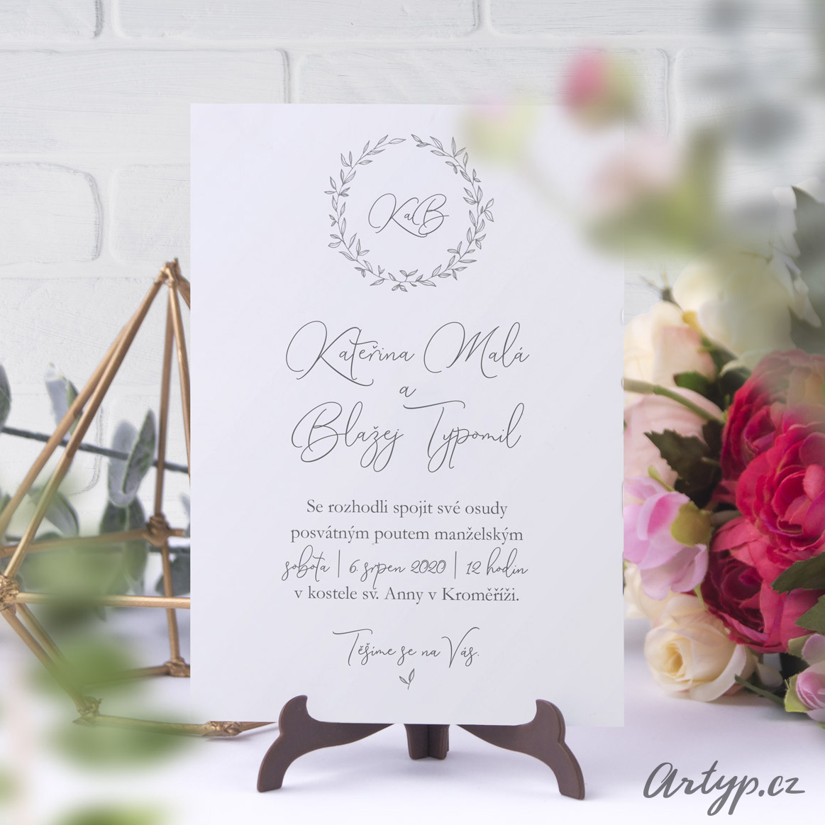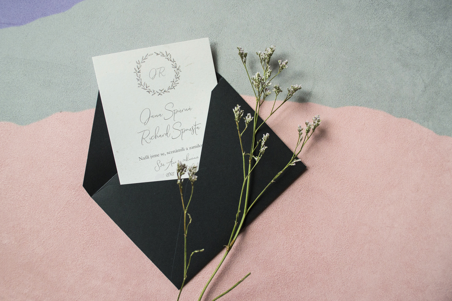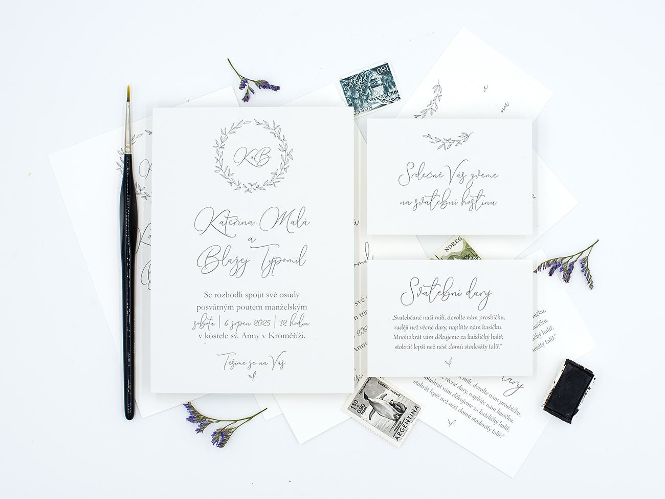 Jednoduché typografické svatební oznámení s iniciály snoubenců v jemném věnečku. V hlavní roli minimalismus a krasopis.