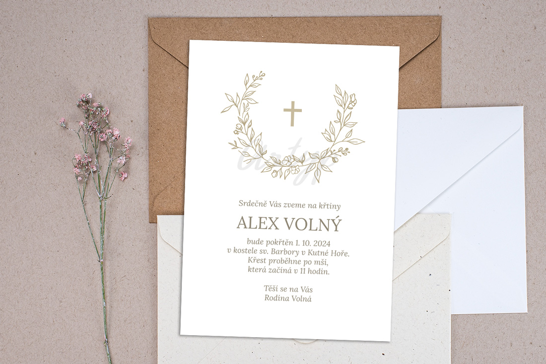 Pozvánka na křest s věncem z větviček jabloně, která je vhodná pro děti i dospělé