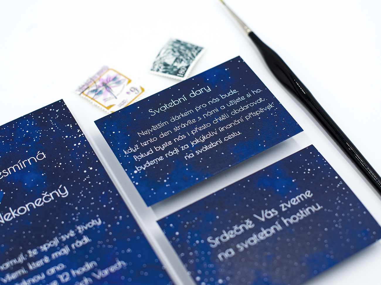Základem je modrý papír na který barevně tiskneme motiv vesmíru a následně se přetiskne bílým textem a hvězdami.