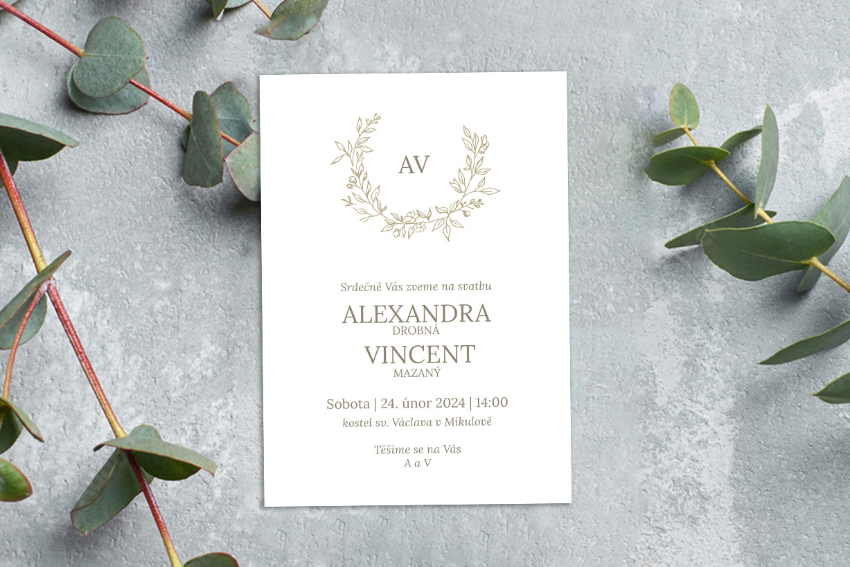 Vložením vašich iniciál do středu věnečku se každá pozvánka stane také vyjádřením vaší lásky a spojení. Barvu věnečku můžeme přizpůsobit vašim přáním, aby každý detail tohoto oznámení byl jedinečným odrazem páru, který si ho vybere.